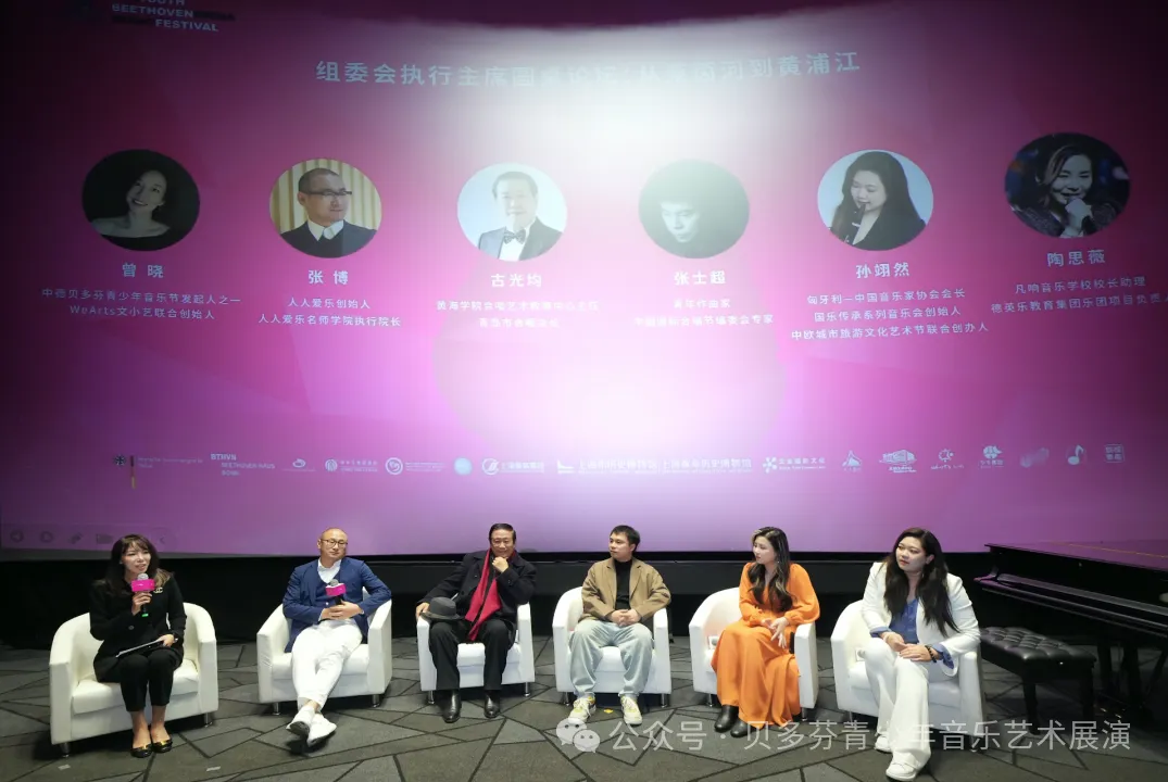 执行主席圆桌论坛环节从莱茵河到黄浦江音乐节的不同板块主办方执行主席张博先生,古光均教授,孙怡然女士,陶思薇女士以及著名青年作曲家张士超强调,贝多芬青少年音乐节的使命不仅是呈现经典,更是搭建一座桥——让青少年在音符间读懂,让西方理性与中国诗意在此共鸣。共同守护这份跨越山河的音乐信仰。