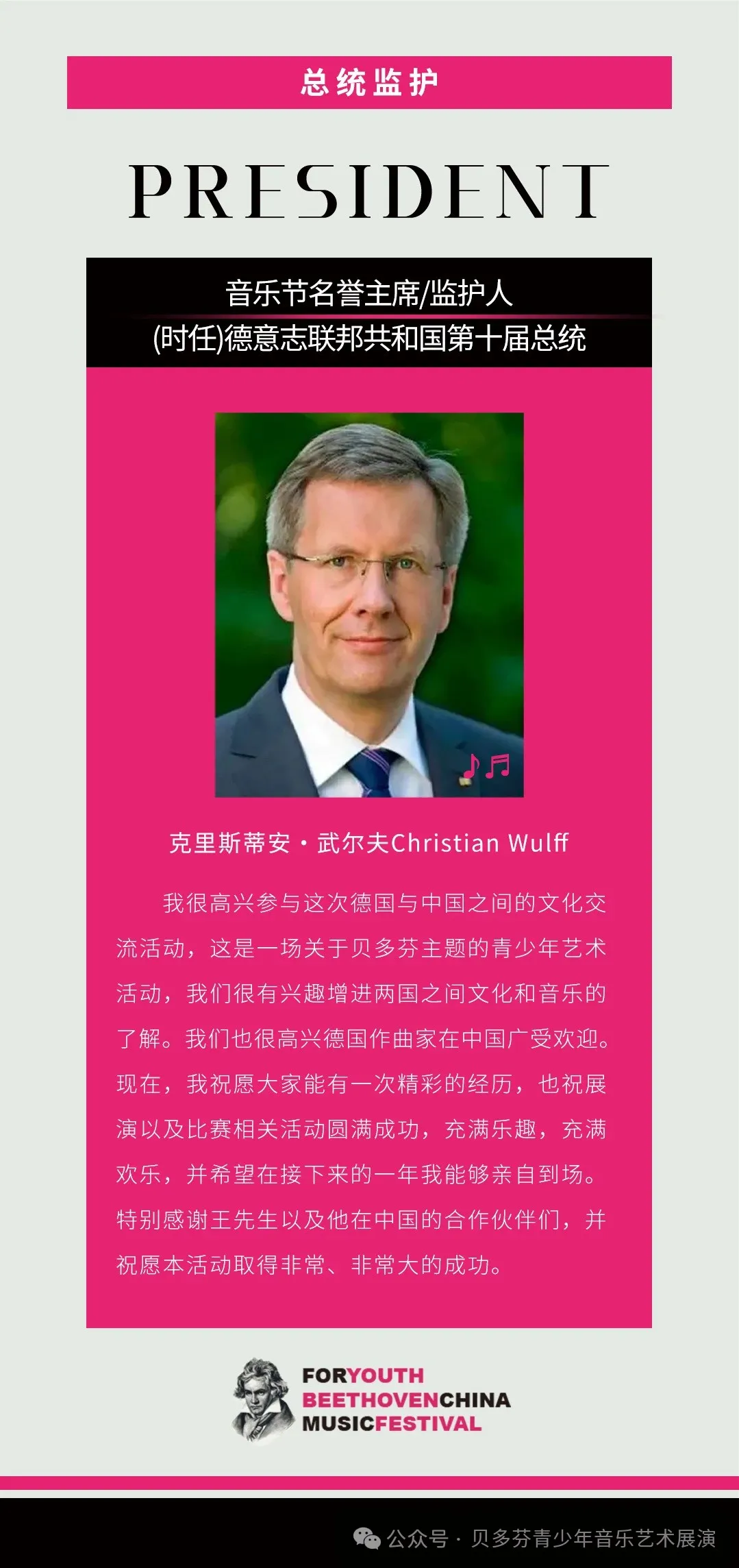 中德⻉多芬青少年音乐节是具有百年历史的世界著名文化机构德国波恩⻉多芬协会BTHVN在亚洲首次官方授权支持并得到德国前克里斯蒂安.武尔夫总统President Christian Wulff亲自担任名誉主席与监护人的中德高级别人文交流项目。